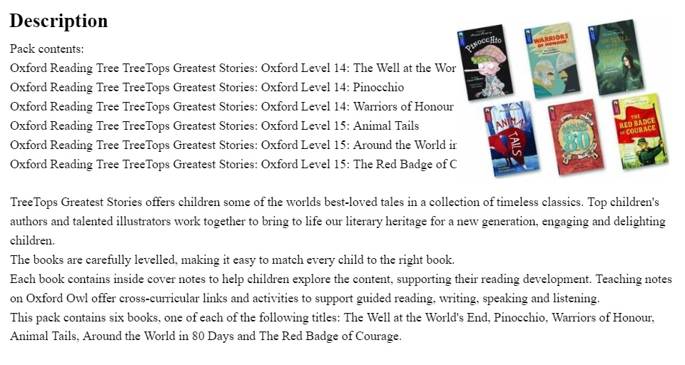 This pack contains one copy of The Well at the World's End, Pinocchio, Warriors of Honour, Animal Tails, Around the World in 80 Days and The Red Badge of Courage.