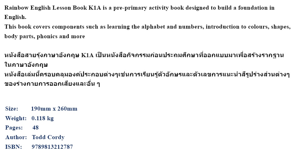 แบบเรียนภาษาอังกฤษระดับอนุบาล Rainbow English Lesson Book K1A