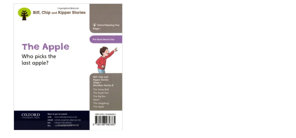 Oxford Reading Tree: Level 1: Wordless Stories B: The Apple เป็นเรื่องราวเพื่อช่วยพัฒนาความเข้าใจภาษาและทักษะการใช้คำศัพท์และประโยคง่าย ๆ จากภาพในหนังสือ เพื่อให้เด็ก ๆ สนุกกับการอ่าน สามารถช่วยพัฒนาการอ่านของเด็กให้ดียิ่งขึ้น