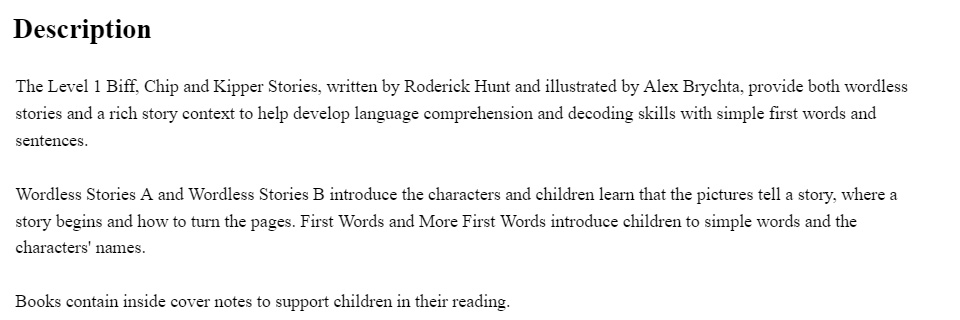 Oxford Reading Tree: Level 1: Wordless Stories B: Fetch เป็นเรื่องราวเพื่อช่วยพัฒนาความเข้าใจภาษาและทักษะการใช้คำศัพท์และประโยคง่าย ๆ จากภาพในหนังสือ เพื่อให้เด็ก ๆ สนุกกับการอ่าน สามารถช่วยพัฒนาการอ่านของเด็กให้ดียิ่งขึ้น