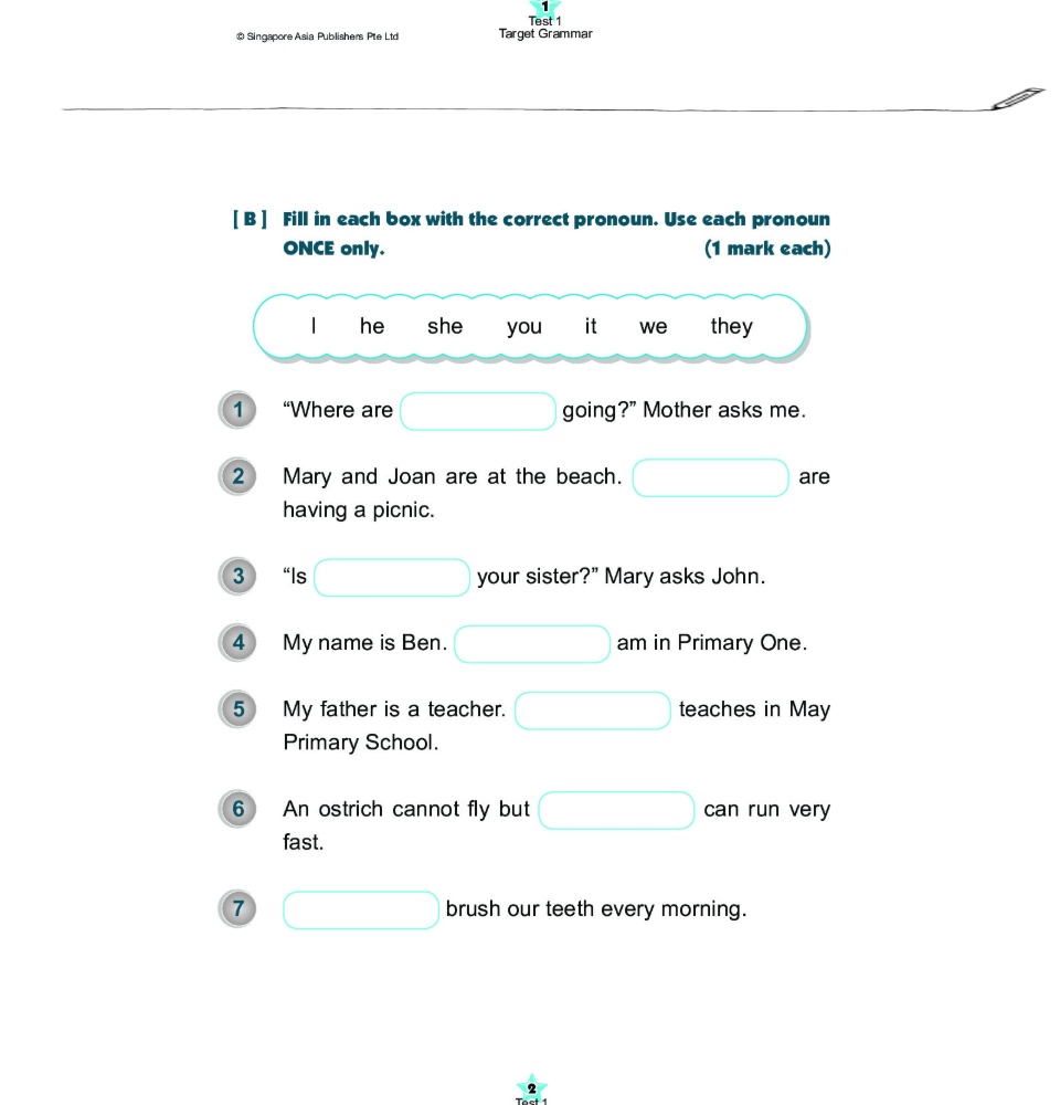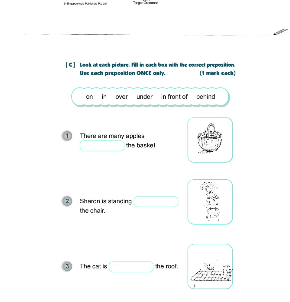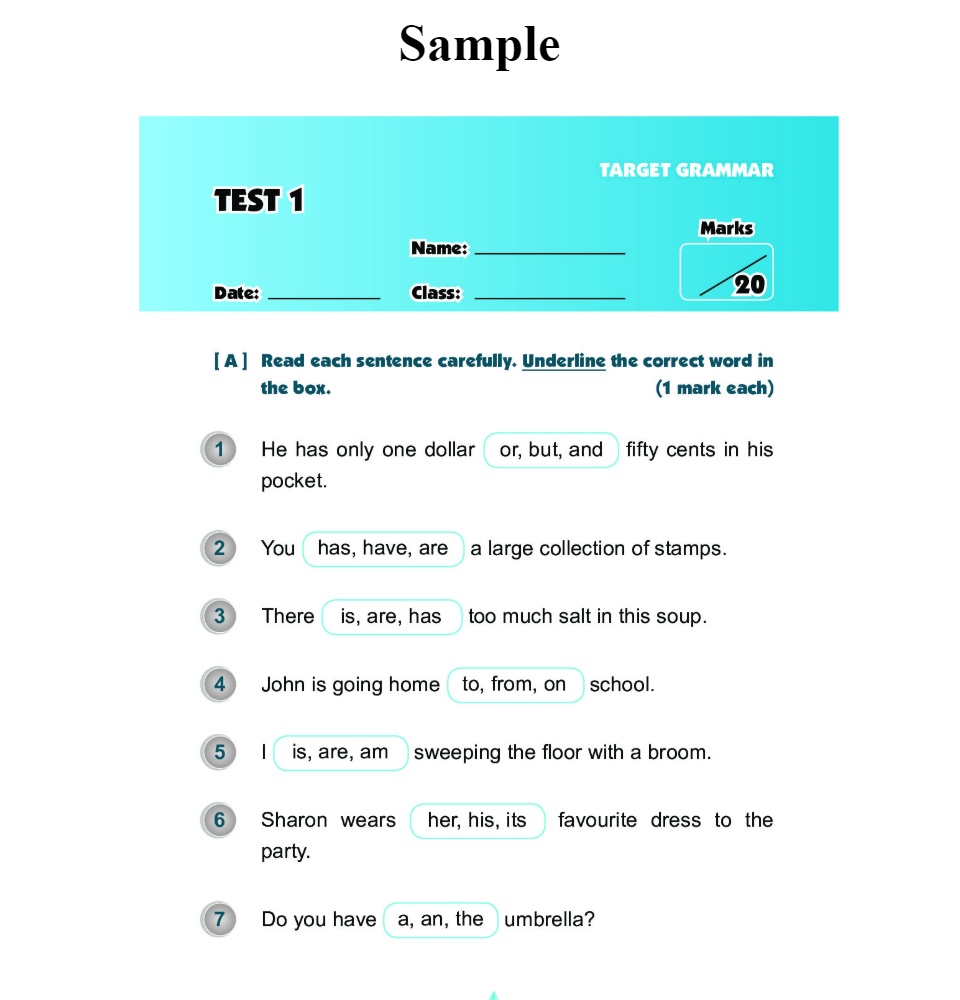 Exam Targets English Book 1 เป็นหนังสือที่รวบรวมแบบฝึกหัดการใช้ Grammar, Vocabulary, Spelling, Sentence Structure, Cloze, Comprehension