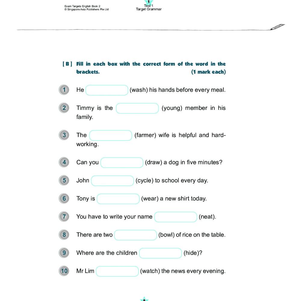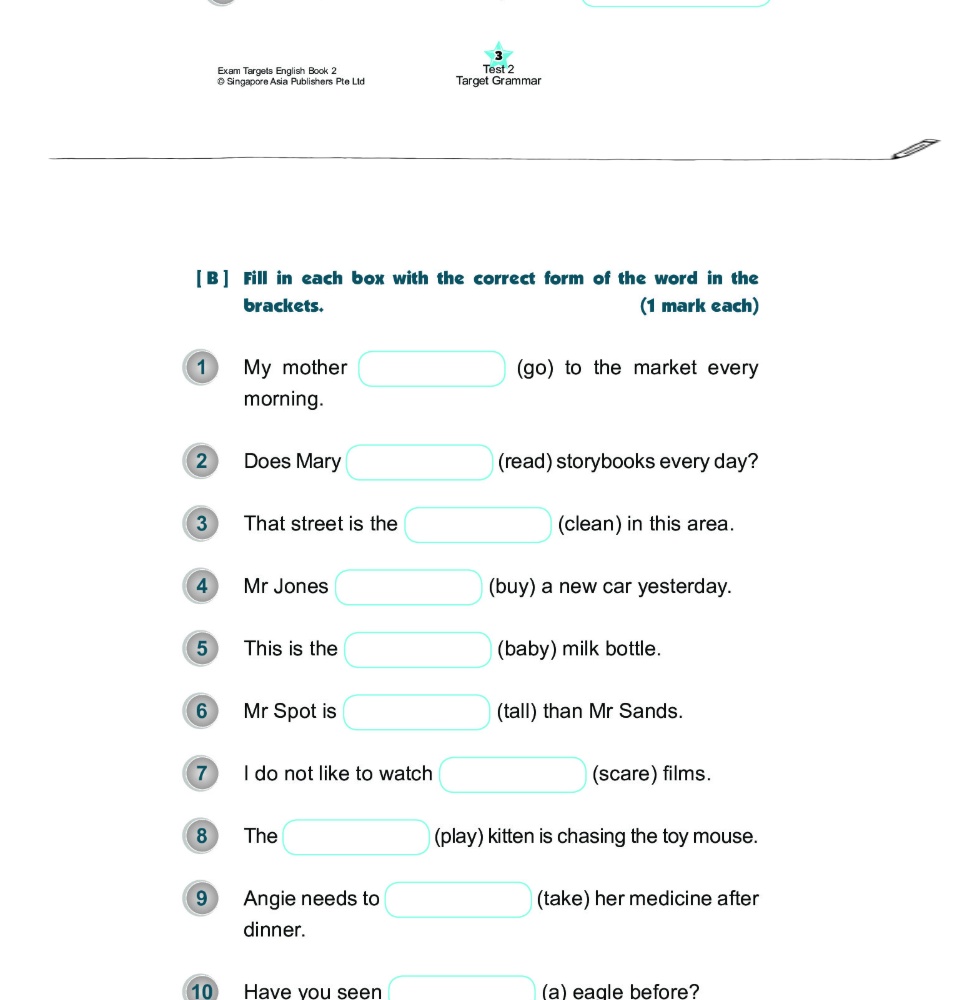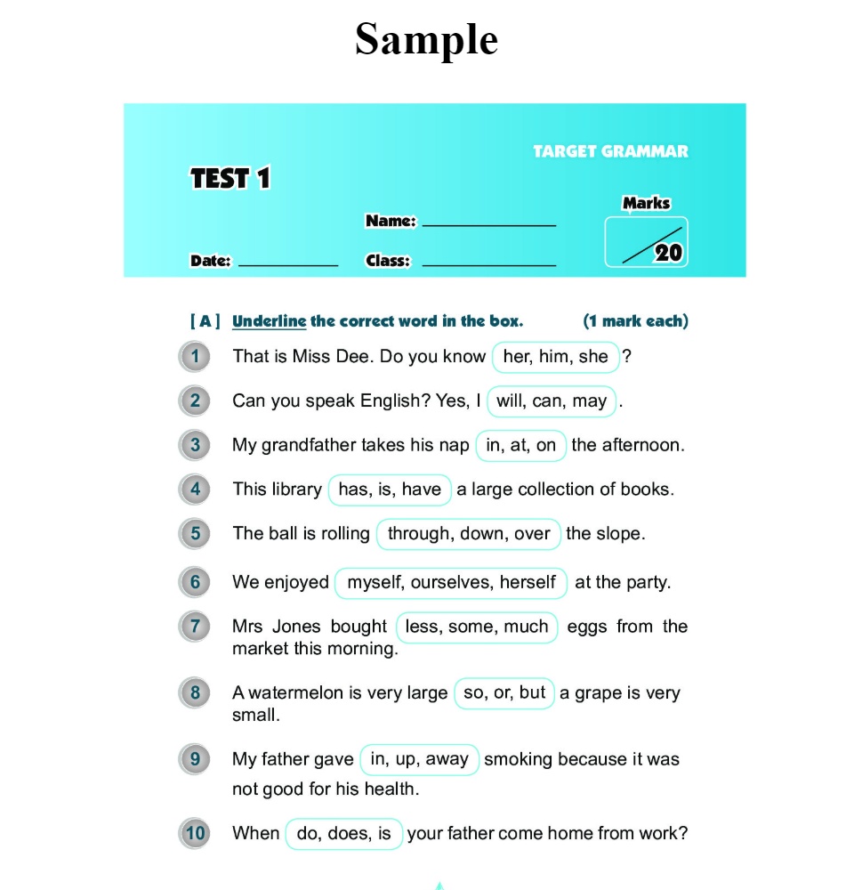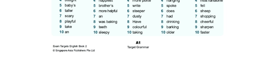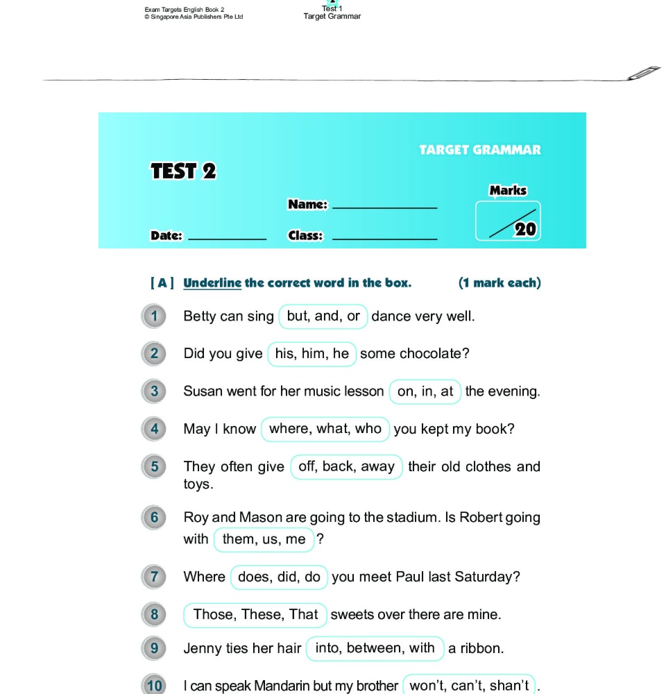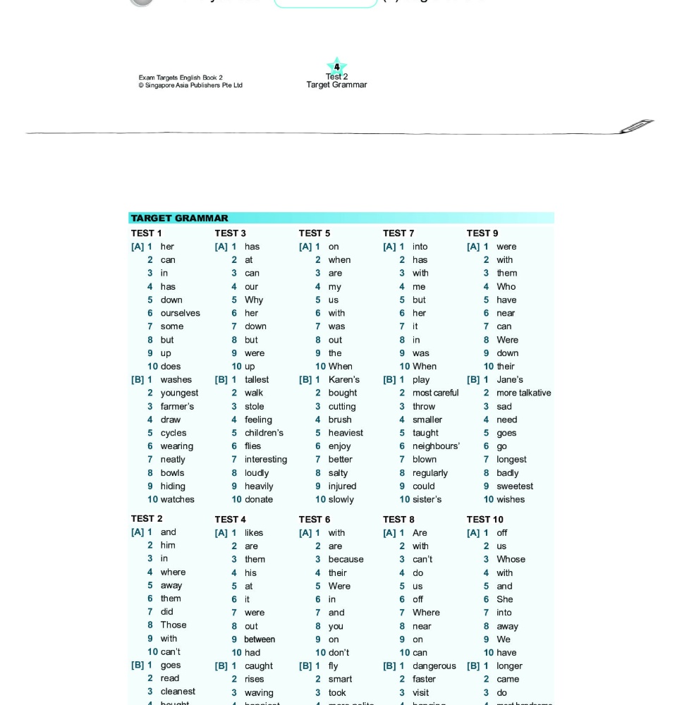 Exam Targets English Book 2 เป็นหนังสือที่รวบรวมแบบฝึกหัดการใช้ Grammar, Vocabulary, Spelling, Sentence Structure, Cloze, Comprehension