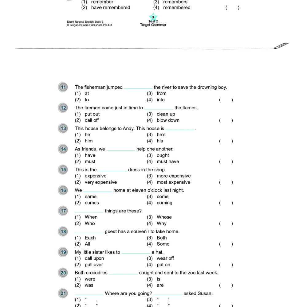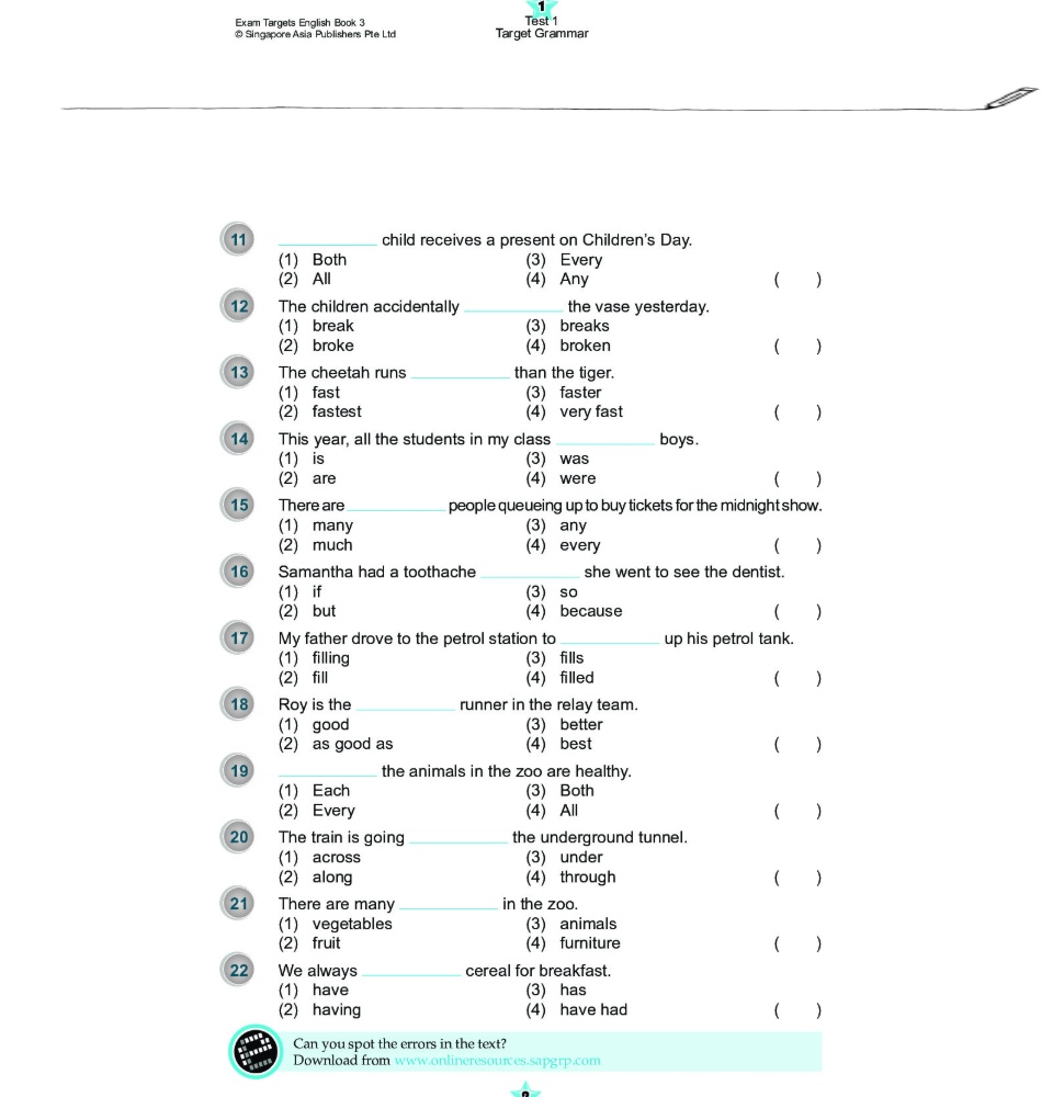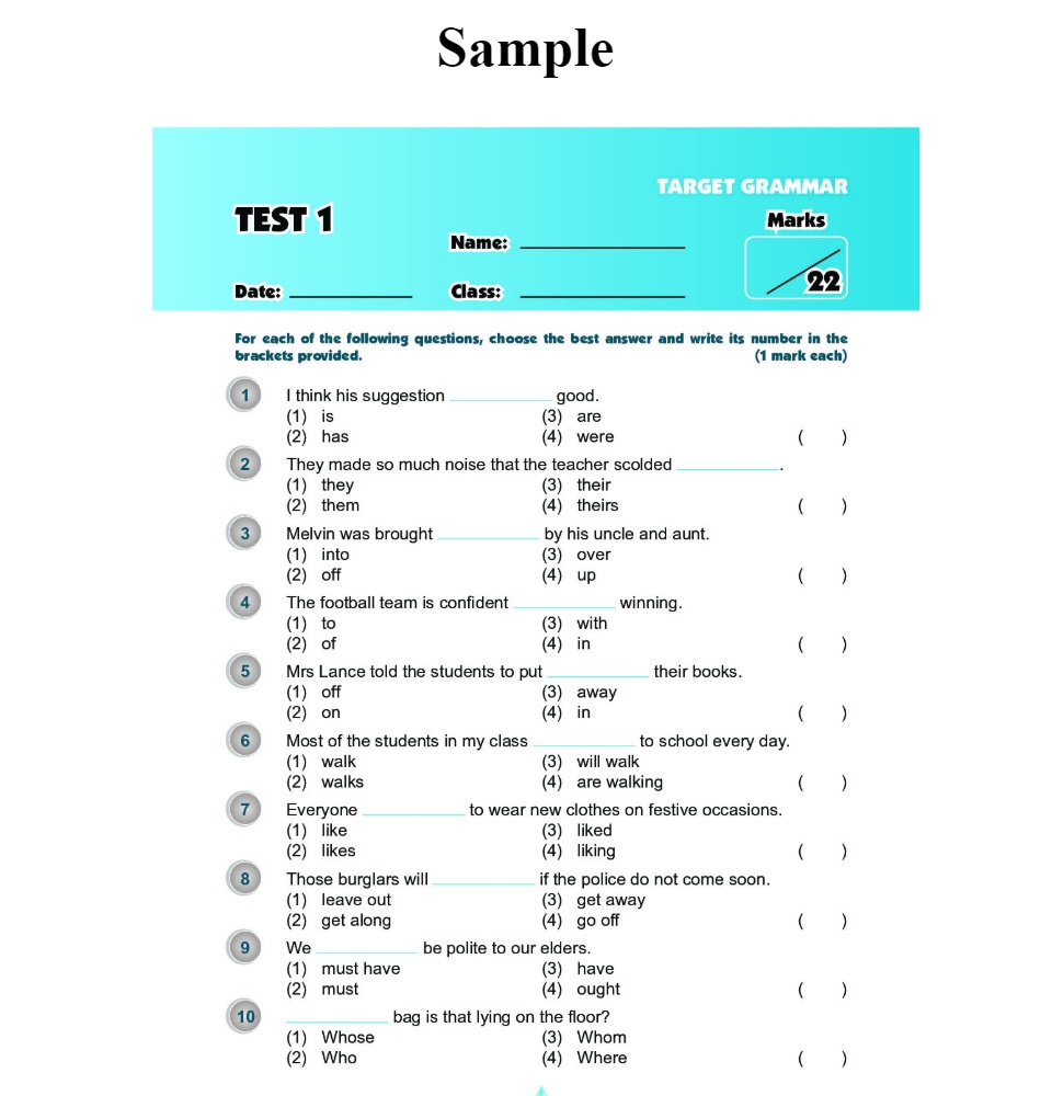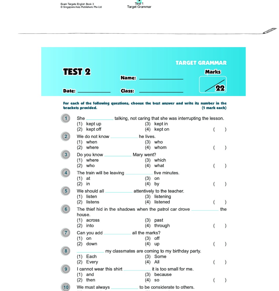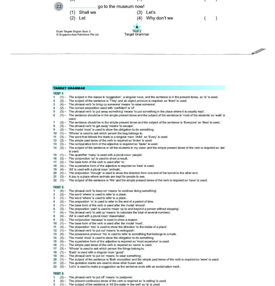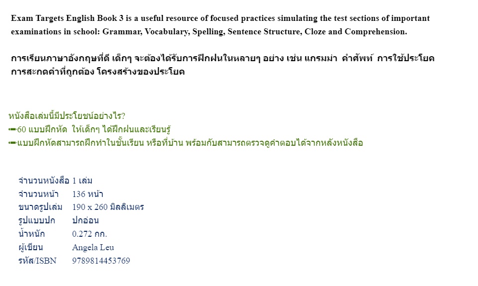 Exam Targets English Book เป็นหนังสือที่รวบรวมแบบฝึกหัดการใช้ Grammar, Vocabulary, Spelling, Sentence Structure, Cloze, Comprehension